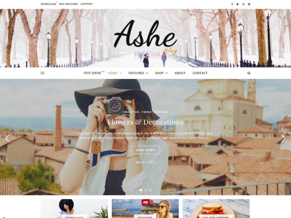 Praxis-Erfahrung: Ashe funktioniert besonders gut für Personal Brands. Die typografischen Details und Instagram-Integration schaffen eine stimmige Brand-Experience für influencer-orientierte Websites sowie Lifestyle Blogs. Allerdings sind die Möglichkeiten für Design-Anpassungen im kostenlosen Theme eher gering.